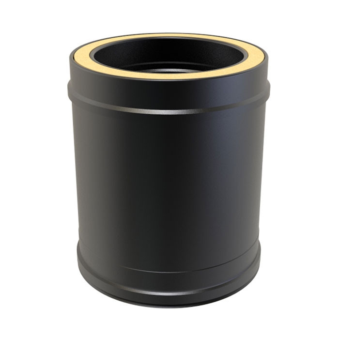 The outer skin to our 250mm 8" twin wall is manufactured from 304 grade stainless steel and is 0.4mm thick, the flue can be powder coated in a high temperature black finish. The fully welded inner skin of the flue is produced from 316 grade stainless steel and is also 0.4mm thick. The insulation is compressed rockwool giving a density of 128kgper cubic metre.