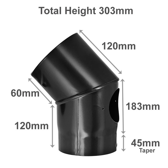 Our 45 degree bend with sweeping hatch (5") diameter vitreous enamel stove pipe is used during installation into an existing chimney or class 1 chimney system. It should not be used to pass through ceilings, walls or directly off an appliance. 45 Degree bends are used to reach backwards into the fireplace, generally two are used in conjunction with each other.