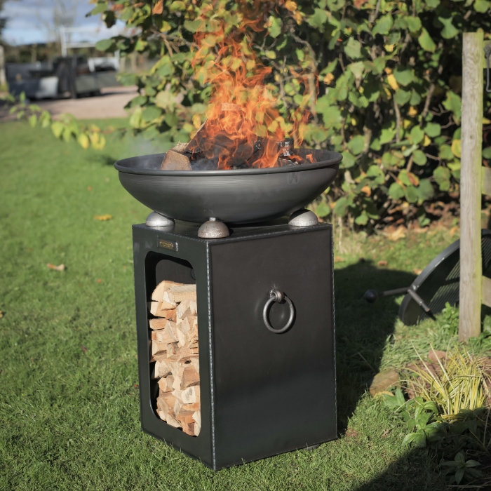 The 60cm fire pit with log store is perfect for keeping your garden warm and the raised height makes it ideal if you want to do lots of cooking. The roomy log store beneath will store plenty of wood and looks very decorative when stacked. This fire pit is handmade in the UK using 3mm British steel which is strong and durable.