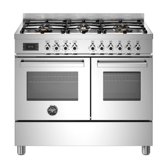 The Bertazzoni PRO106L2EXT Professional Series 100CM 6 burner electric double oven provides great versatility and style to your kitchen. The main oven electric oven has 11 functions, from convection, baking and grilling to warming and features a thermometer on control panel. The useful auxiliary oven has four modes. Triple-glass doors minimise heat loss. The hob has six versatile gas burners including a dual-ring power burner giving anything from a delicate low simmer to full power.