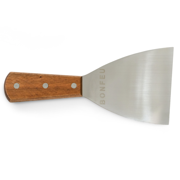 Its sharp-edged blade is perfect not only for flipping food on the cooking plate, but also for loosening stuck-on ingredients and scraping away residue or excess oil. Whether you're grilling, searing, or simply cleaning the plate, this spatula is a must-have tool for any BonFeu cooking unit.
