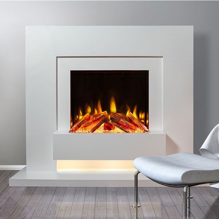 The Celsi Luminaire 600 electric fireplace consists of a a contemporary wooden fireplace surround in a smooth white finish with a matching base unit and hearth. This revolutionary electric fire displays bright and beautiful ascending flames from the deepest, most realistic 'Active Blazing Embers’ ever designed into an electric fuel effect.