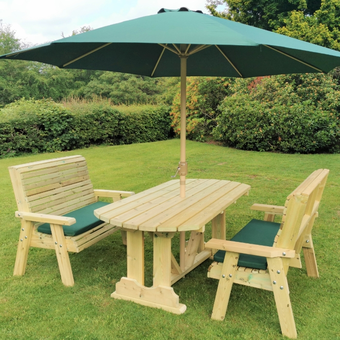 A truly stunning garden set including a stylish table and two 2-seater benches. This beautiful arrangement has been built by British craftsmen in this unique style using the finest Swedish Redwood. Extra care has been taken to have the wood pressure treated which prevents rot for up to 25 years.