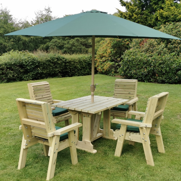 A truly stunning garden set including a stylish table and 4 chairs. This beautiful arrangement has been built by British craftsmen in this unique style using the finest Swedish Redwood. Extra care has been taken to have the wood pressure treated which prevents rot for up to 25 years.