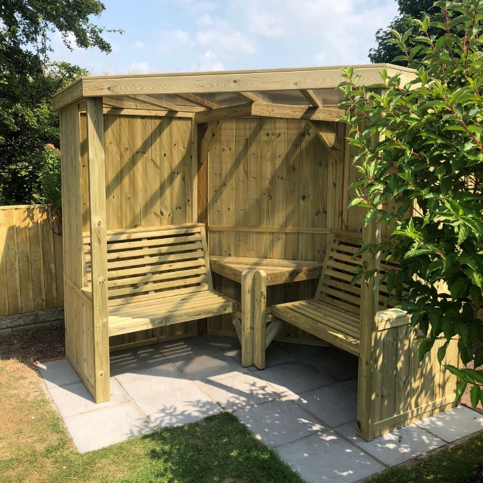 Designed for all year-round use there is no better way to enjoy those mild autumn nights or crisp winter mornings than sitting in your new garden room with a hot mug of tea or coffee. This hand-crafted garden room comes complete with a polypropylene roof to shelter from the elements but also allows the sun to shine through, it is fully pressure treated for longevity and is fitted with two comfortable benches which will sit a total of four adults. You can also purchase a coffee table to finalise this aesthetically marvelous product.