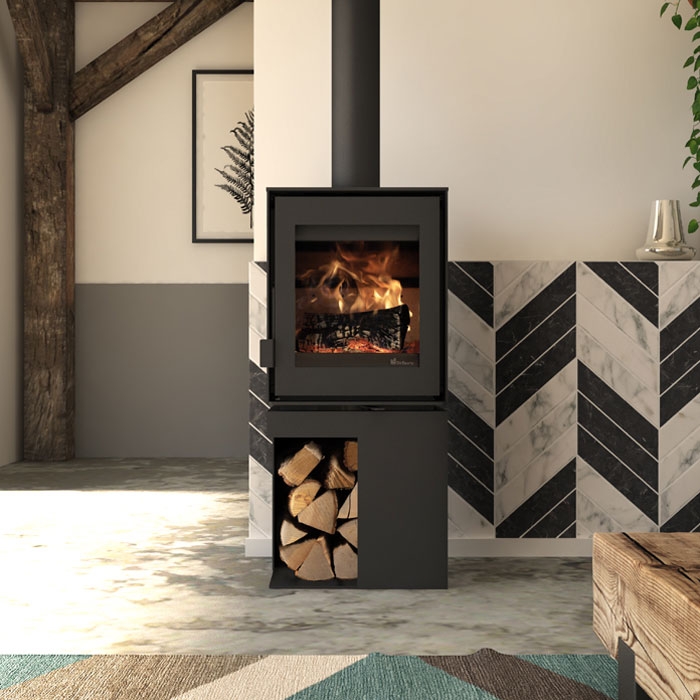 The Dik Geurts Modivar 5 Corner Log Store Wood Burning Stove is a stylish and practical heating solution designed for freestanding installations. The corner log store base raises the body of the Modivar 5 by 440mm, providing a modern look while offering convenient log storage to keep firewood within reach. The side-loading log store creates a visually appealing feature that serves as a focal point in modern or minimalist interiors.