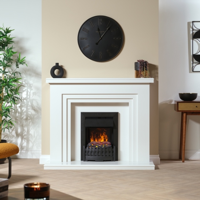 Using Dimplex’s advanced Optimyst technology, the Elsberry creates a realistic 3D flame and smoke effect using ultra-fine water mist and lighting, which looks far more lifelike than standard electric flame effects. A coal fuel bed is included as standard, with an optional log effect available if you prefer a wood-burning look. Classic cast fret detailing adds character and a traditional finish.