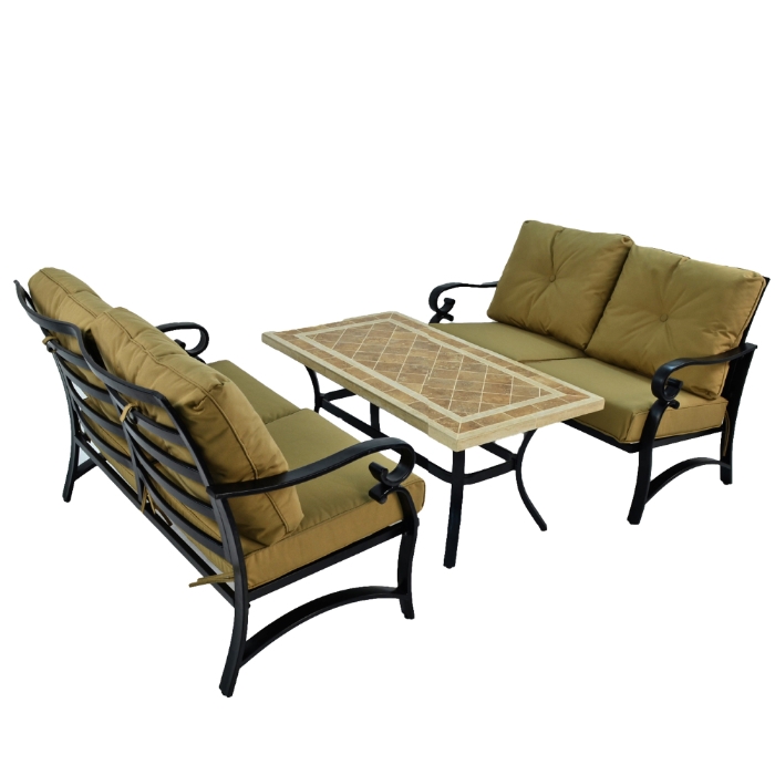 The Europa Leisure Hampton Coffee Set includes a Windsor Deluxe 2-seat sofa, two Windsor Deluxe lounge chairs and the Hampton 120cm coffee table. The simple yet classically designed tabletop is of high-quality smooth ceramic tiles in warm tones of cream and light terracotta and is cut and placed by hand.