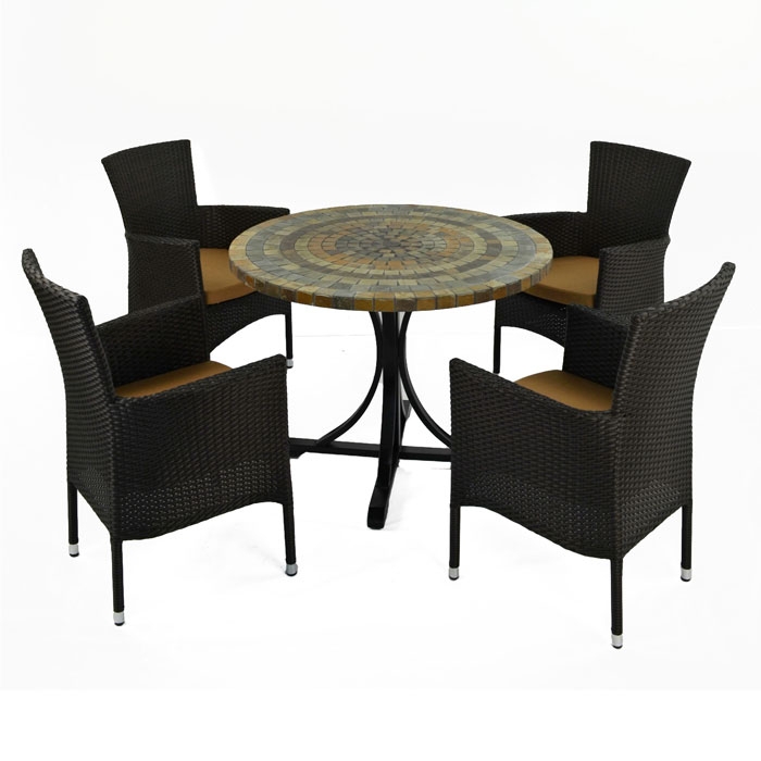 This dining set consists of the Monterey dining table and a 4 seater set of the Stockholm wicker chairs in a choice of black or brown finish. With its warm natural earthy tones, the Monterrey 100cm table is a fine way to dine the summer away. The handcrafted mosaic top makes each table subtly unique, every tile is cut by hand and positioned by hand.
