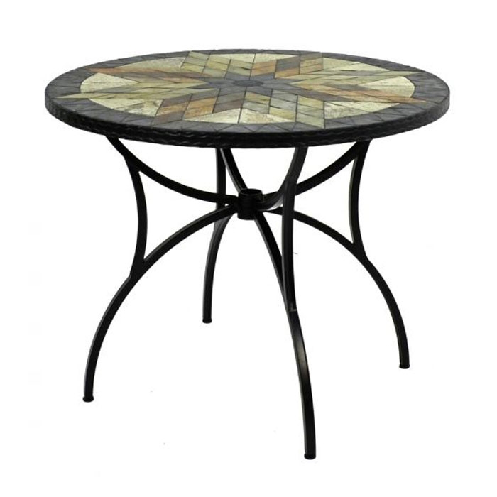 The Montilla 91cm table has a plethora of hand cut hand laid tiles in natural stone.The warm earthy colours will complement the garden and its sturdy nature allows for full dining to take place, seating 4 comfortably. The sturdy ornate steel legs are powder coated black and match the steel rim around the outside of the table top.