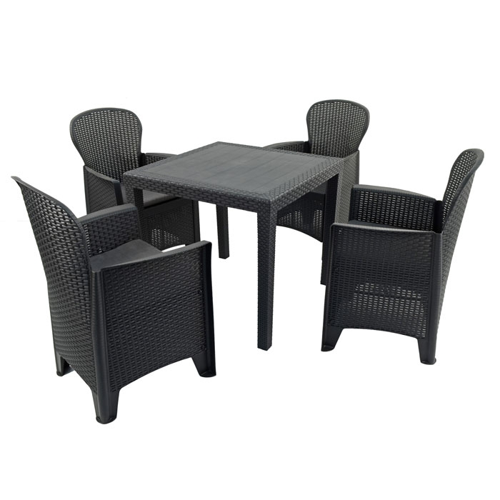 This sets consists of the Salerno square table with four Sicily chairs in an anthracite finish. The stylish Sicily chairs are extremely comfortable and can be used as dining chairs around the Salerno square table. Made from highly durable polypropylene, the table and chairs are very easy to assemble and to maintain and will look stunning in any garden.