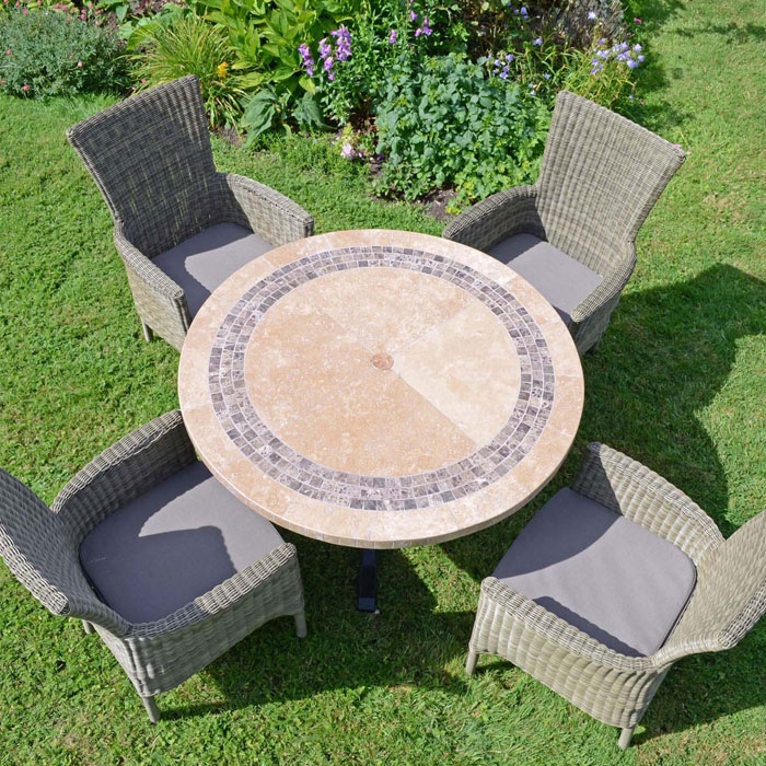 This dining set consists of the Vermont dining table and a 4 seater set of the Dorchester wicker chairs in a light brown finish with brown fabric cushions. The wonderfully crafted Vermont table is an ample 4 seat dining table, what makes it so special is the handcrafted marble stone tiles, they are wonderfully smooth and the warm colours reflect in the sun. The sturdy steel leg is powder coated neutral black and will allow for a parasol.