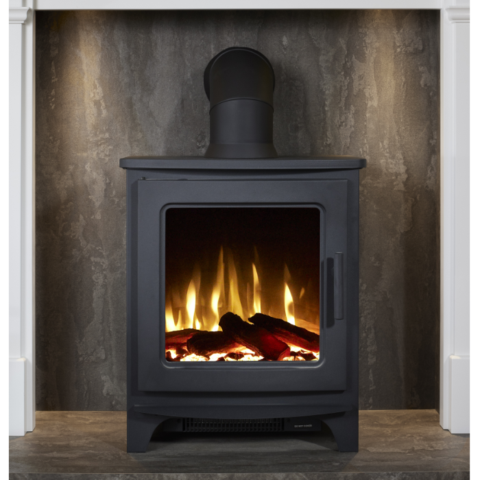 - Optional extras include a decorative flue pipe and hearth with back panel