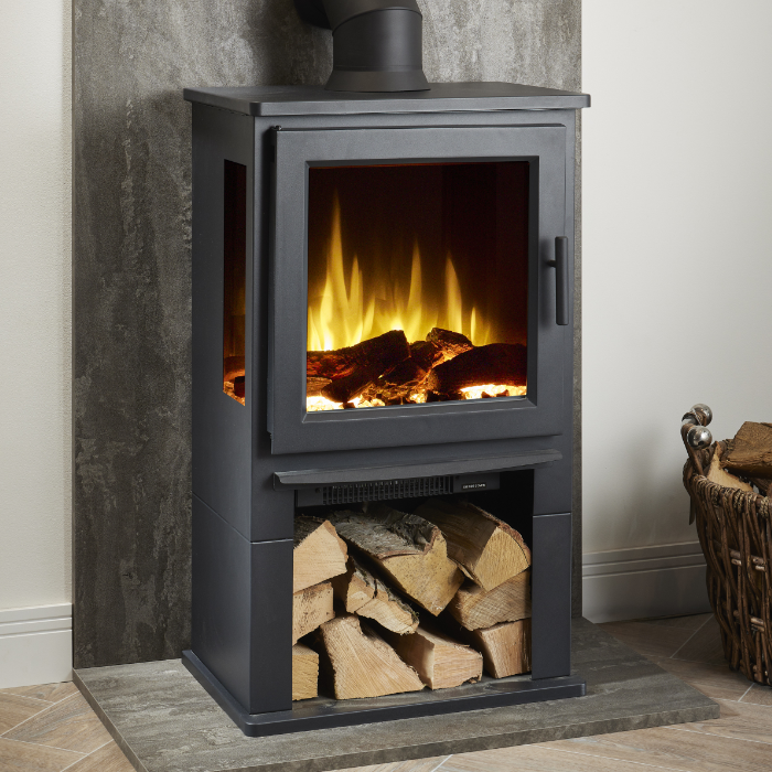 The Naples Electric Stove with Log Store is designed to brings practicality to your home. Its panoramic 3-sided glass design means the flame effect can be enjoyed from the front and both sides, making it a true focal point in your room. The built-in log store beneath the stove provides handy storage space, helping to keep your room neat and tidy. With this stoves hand-finished glowing log-effect fuel bed and black crystal ash base, it creates a realistic ember glow, while seven flame colours and seven fuel bed options give you the freedom to set the perfect look.