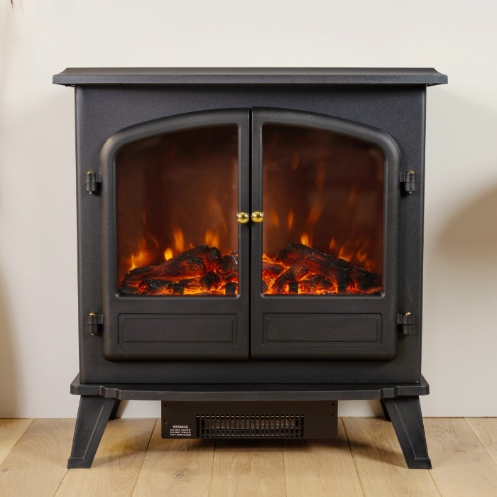 - Traditional freestanding stove design with opening double doors creates an authentic fireplace look
