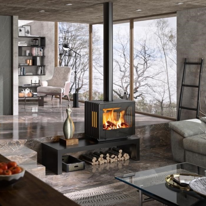 Designed to be wall mounted or mounted on a table, this wood burning stove can create a striking floating effect, transforming the stove into a dramatic architectural focal point while freeing up valuable floor space. Its wide panoramic glass front delivers an immersive view of the flames, enhancing ambience and bringing warmth and character to modern living areas. The ribbed cast iron exterior not only adds distinctive texture and elegance but also increases surface area for improved heat distribution.