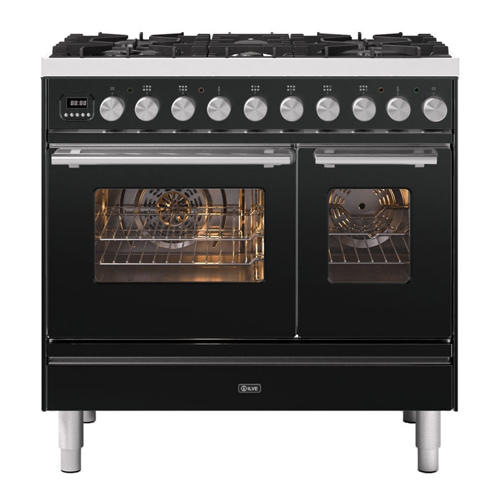 The ILVE Roma 90cm dual fuel range cooker features a 6-burner gas hob and two electric multifunction ovens, blending modern design with versatile cooking options. Its sleek, contemporary look makes it a great fit for today’s kitchens.