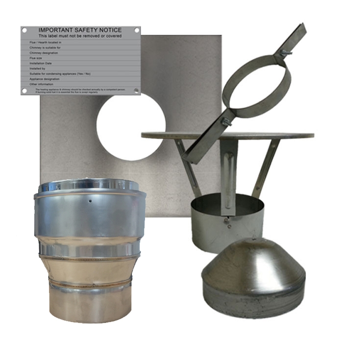 For use with 150mm diameter multifuel flexible flue liner - This installation pack contains a top plate, top clamp, top sleeve insert, top cowl, nose cone, increasing adapter from 125mm or 100mm vitreous enamel or stainless steel single wall flue pipe to 150mm multi-fuel liner and a chimney notice plate.