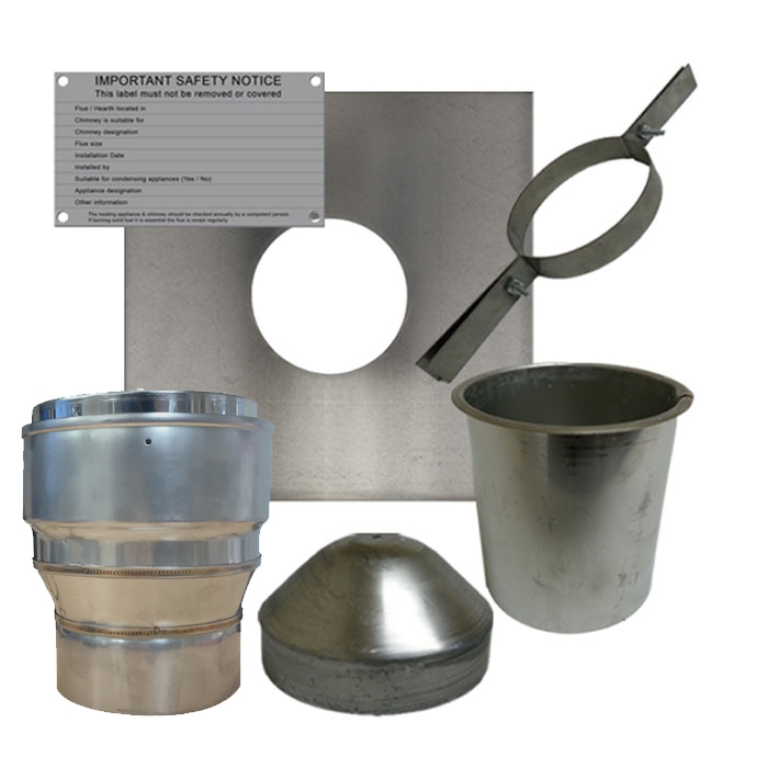 For use with 200mm diameter multifuel flexible flue liner - This installation pack contains a top plate, top clamp, top sleeve insert, nose cone, increasing adapter from 175mm or 150mm vitreous enamel or stainless steel single wall flue pipe to 200mm multi-fuel liner and a chimney notice plate.