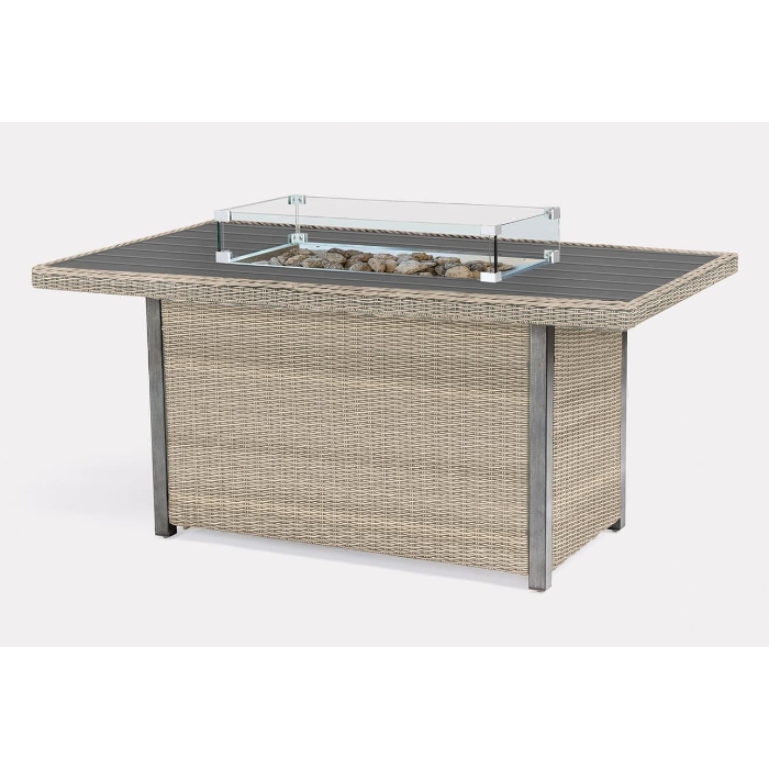 Made from high quality 5mm half round wicker this fire pit table is completely weatherproof and resistant to UV which means it is durable and will stand the test of time. Compatible with a 5kg propane gas tank, this table comes with a very discreet door to hide it away out of sight and it also includes a stainless steel lid to cover the fire pit when not in use. You also receive a glass panel that acts as a windbreak and will prevent any ash from escaping.