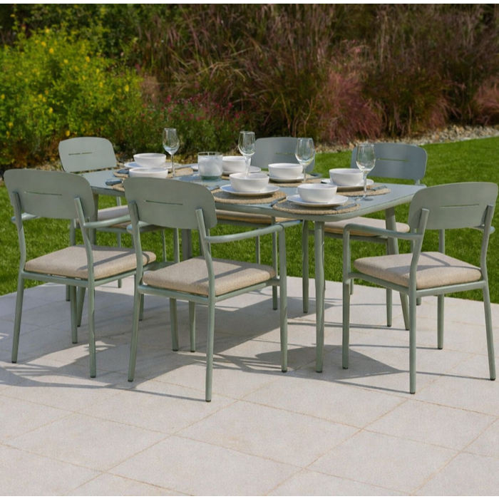 Crafted from high-quality powder-coated aluminium, both the table and six matching chairs deliver exceptional strength and durability without the heaviness or upkeep of traditional steel or wood. The lightweight design makes rearranging or storing the set effortless, while the powder-coated finish ensures long-lasting resistance to rust, fading, and the elements—perfect for year-round outdoor use. The Verde Green finish adds a vibrant yet natural touch, harmonising seamlessly with any garden, patio, or terrace. Sleek, contemporary lines provide a sophisticated look, while ergonomically designed chairs guarantee comfort for hours of dining or conversation.