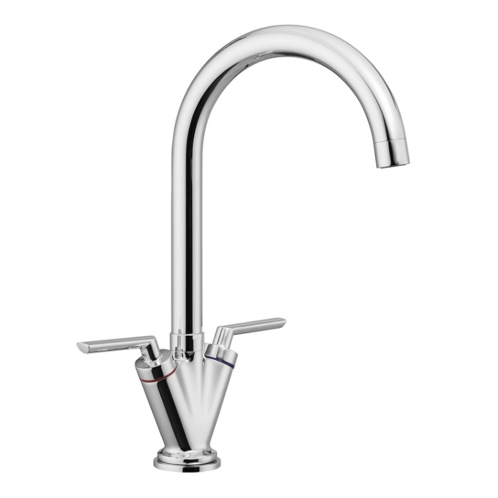 The Aquatwin monobloc kitchen tap features a twin lever design paired with an integrated plinth and tall sweeping neck. Made from brass with a chrome finish.