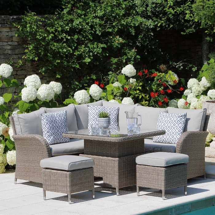 The LG Outdoor Monte Carlo Sand Compact Dining Set features the Monte Carlo Sand Compact modular sofas, footstools & a height-adjustable table that can be raised to dining height or lower for lounging. The corner sofa has enough seating for 5-6 people and the two footstools can provide additional seating if needed. The table is large and features a 5mm safety glass top.