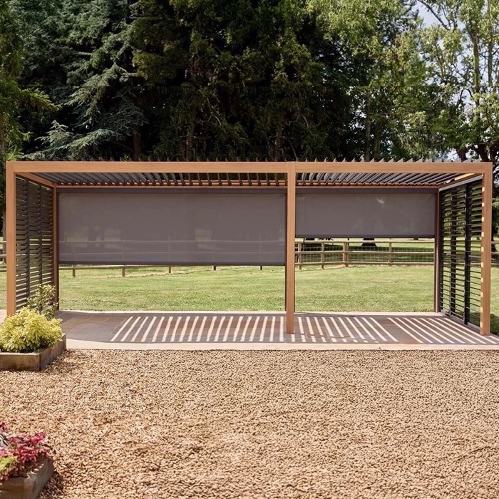 The frame is made from aluminium, so it is sturdy and doesn’t require the upkeep of real wood. It has a heat transfer oak effect finish, which gives it a more natural look without the need for regular treatment. The louvred roof can be adjusted depending on the conditions. You can let light and air through when it is warm, or close it to provide shade or shelter from light rain. The height of 2.5m keeps the space feeling open without being too exposed.