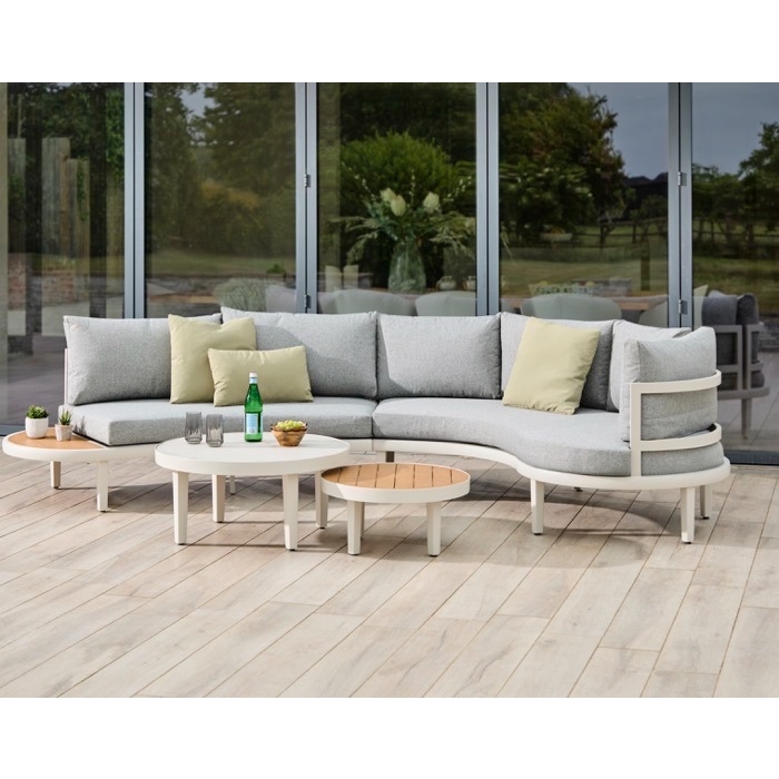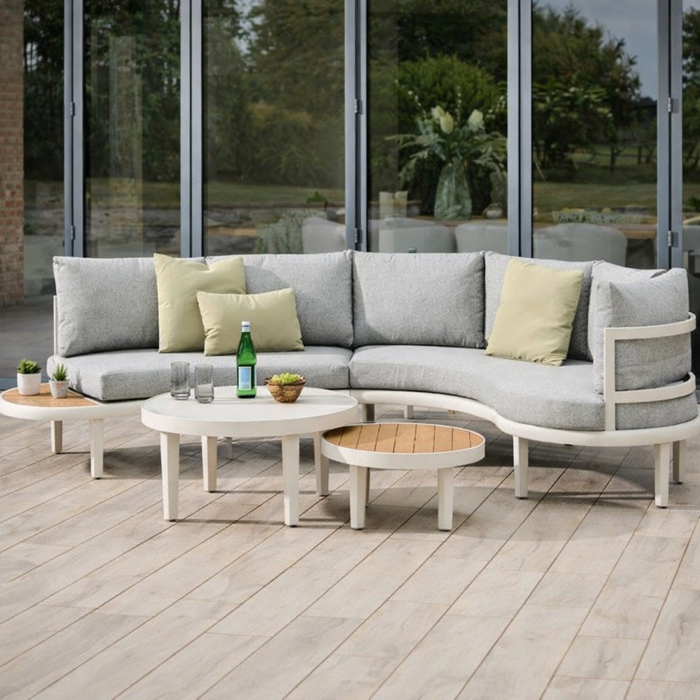 This elegant set includes a large modular sofa made up of left-hand and right-hand sofa sections, offering generous seating and the flexibility to suit your layout. Complementing the sofa are two coordinating coffee tables, one large and one small—both finished with printed ceramic glass tops, providing versatile surfaces for drinks, snacks, and outdoor accessories. Built on a lightweight yet robust aluminium frame, the set features a hand-brushed wood-effect finish that delivers the natural look of timber with the durability and low-maintenance benefits of metal. Comfort is enhanced with deep, season-proof cushions made using environmentally friendly EcoCore poly fibre. These cushions are stain-resistant, quick-drying, and designed to retain their shape over time.