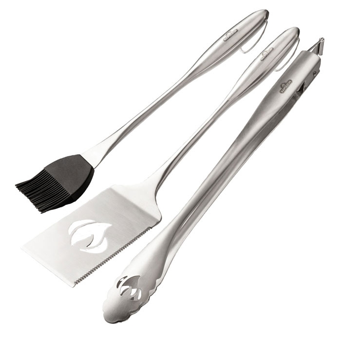 The 3 piece set consists of an extra long spatula making it easy to flip and turn all kinds of food, a set of tongs which can be locked and unlocked and a basting brush to add sauce to your succulent meat or grilled veg.
