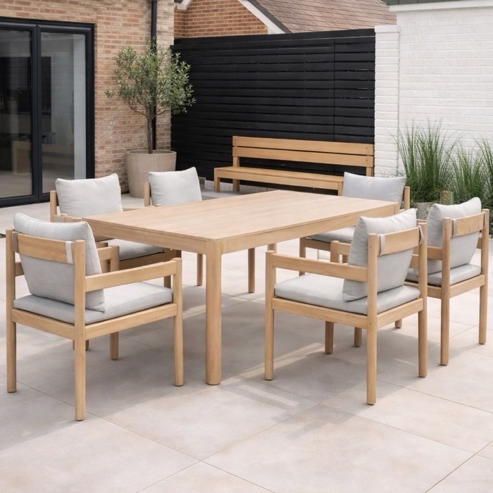 Crafted from FSC-certified eucalyptus wood with a light teak finish, the Nestune dining set offers both durability and a warm, natural aesthetic that blends seamlessly into any outdoor setting. The set features one spacious rectangular dining table, providing ample room for meals, drinks, and conversation, along with six ergonomically designed dining chairs. Each chair comes complete with plush light grey back and base cushions, delivering exceptional comfort while maintaining a sleek and modern look.The timeless design of the Nestune 6 Seat Dining Set ensures versatility, making it suitable for a variety of outdoor spaces and decor styles from contemporary patios to classic garden settings. Its robust construction ensures longevity, while the FSC-certified wood reflects a commitment to sustainable, eco-friendly furniture.