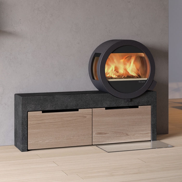 The brand new Nordpeis Me comes with a circular front and cylindrical body to create a uniquely designed stove. The Nordpeis ME With Concrete Bench Wood Burning Stove is supplied with a concrete bench, precision cut and perfectly designed to house the circular shape of the ME. As well as the concrete bench Nordpeis also manufacture a choice of bench boxes to sit underneath, choose from oak fronted or black steel fronted to finish off the appearance, alternatively use the space underneath as a logstore, the choice is yours.