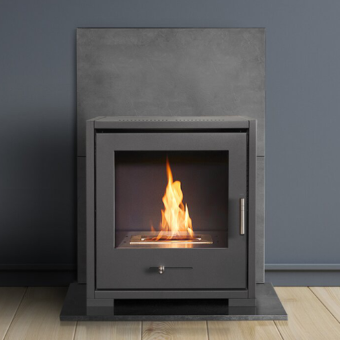 - Charcoal grey bio ethanol stove featuring a sturdy stainless steel burner for reliable performance