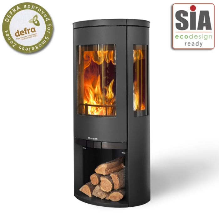 The Opus Trio LS is a super modern, cylindrical wood burning stove that can be enjoyed from all angles thanks to the side glass viewing panels. A stylish log store raises the Opus Trio LS, making it a dominant feature of your living space.