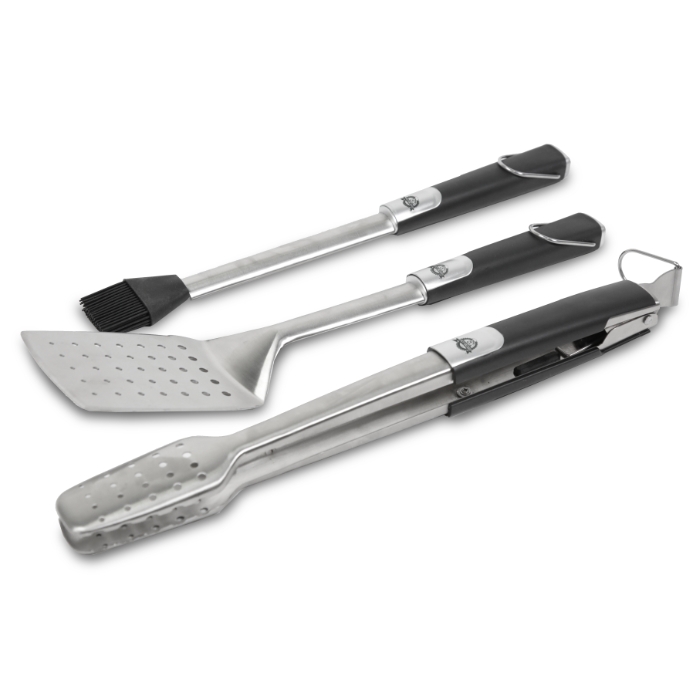 The Pit Boss Soft Touch 3-Piece Tool Set has all the essentials to make you the boss of the grill. This handy set includes a pair of locking tongs, a slotted spatula, and a silicone basting brush. Each tool has a heavy-duty stainless body and soft-touch handle for long-lasting, comfortable use. They each feature enlarged hanging loops so your tools can stay right within reach. Grilling up your favourite recipes just got easier with this dependable BBQ grill toolset.
