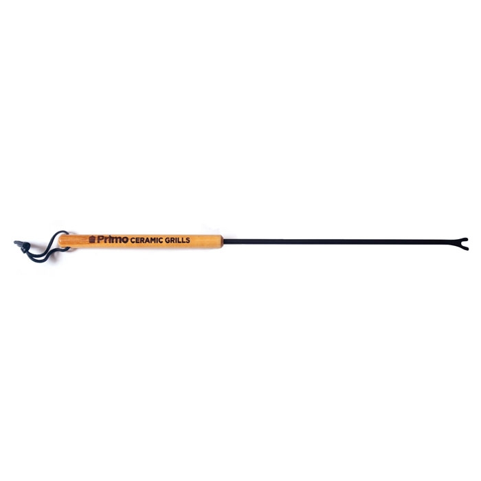 Designed to last for years with a logo branded wood handle and steel cleaning rod with a rust-resistant coating. The cleaning fork tip easily removes food residue from cooking grate rods and it will not damage porcelain coated grates. With a simple twist, you can also clean the sides of the grate rods. The 23" length keeps a user's hands away from the heat of the charcoal. The Grate Cleaning Bar eliminates the need to replace stainless steel brushes and eliminates the potential health hazard of wire bristles being introduced onto the food