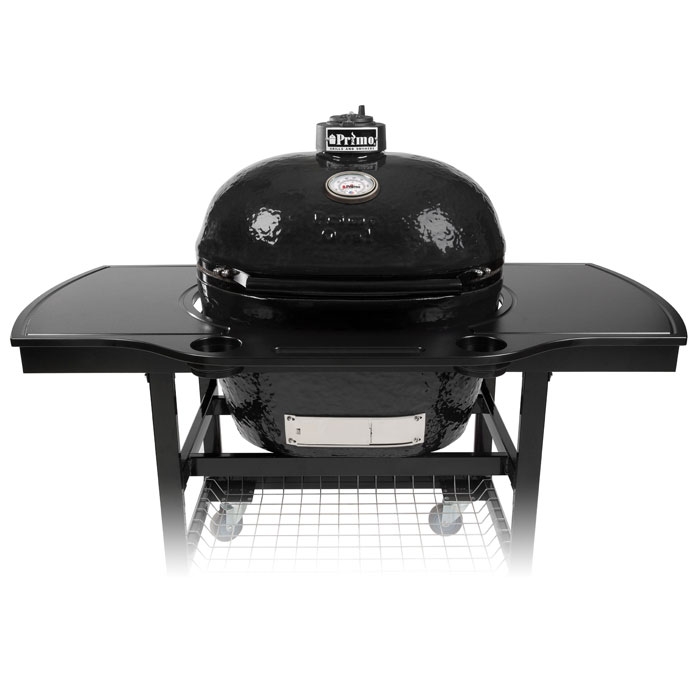 Mounted on the cart, it allows you to move your Primo grill to your desired location and hold into position with the lockable front castors. The table is both UV and mold resistant and the shelves are FDA approved for use with food. An addition to the one-piece island top is the two cup holders on the front.