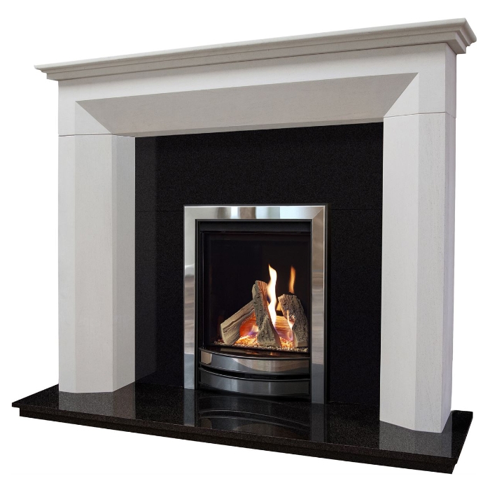 The Michael Miller Passion fireplace consists of a Portuguese limestone surround and mantlepiece with a black granite back panel and hearth and the Michael Miller Passion HE gas fire. This gas fire comes with the MM Signature fascia which is available in a variety of colours to match your interior.